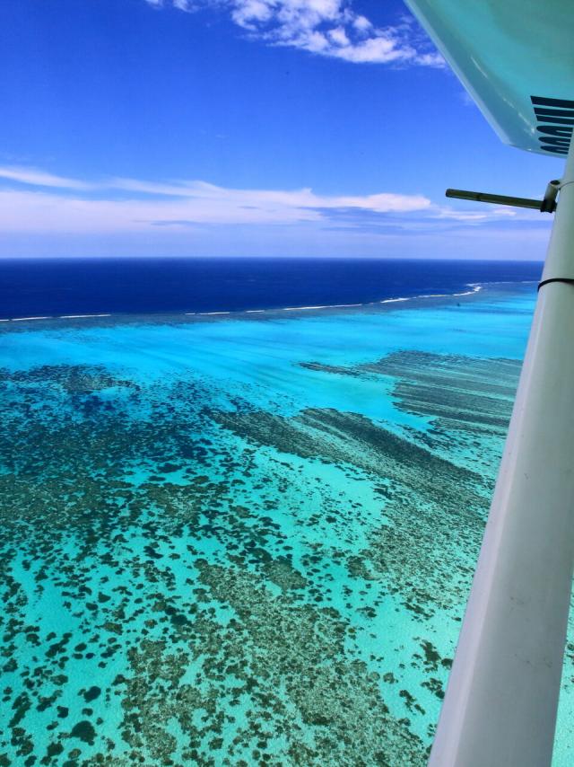 ニューカレドニアのラグーン上空を飛ぶヘリコプター