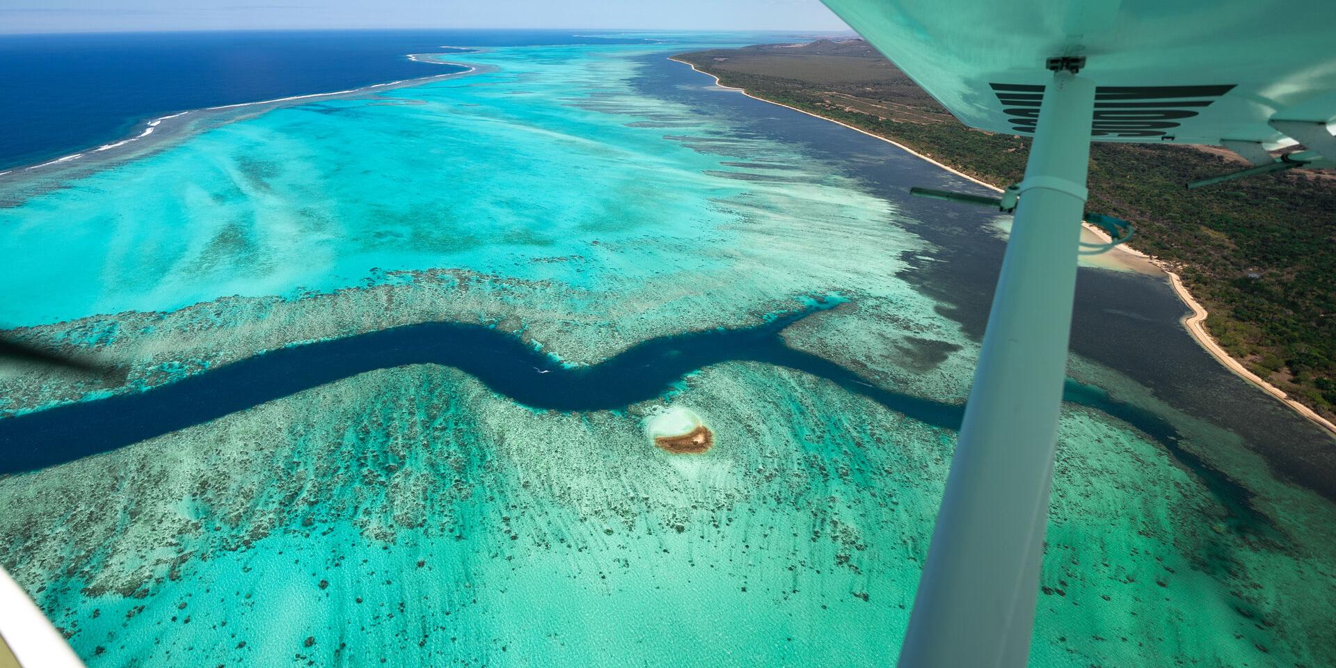 ニューカレドニアは、地球上のほかのどこでも見られない豊かな海洋生態系と陸上生態系を誇り、見たこともないほど多様な景観を提供しています。24,000km²のラグーン、全長1,600kmのサンゴ礁、広大な水中林、ドラマチックな石灰岩の崖などです。これらの自然の驚異は、天空からその真の素晴らしさを見せてくれます!ウルトラライトプレーン(ULM)、ジャイロコプター、ヘリコプター、パラモーター、水上飛行機のどれを選んでも、これらの風景が呼び起こす感動は、飛行のスリルと一体です。パラモーターやジャイロコプターの開放的なコックピットは、視野が開けているのでウミガメ、クジラ、イルカなどの海洋生物を見つけたり、美しい写真撮影を可能にしてくれます。また、パイロットが操縦させてくれれば、忘れられないひとときを過ごすことができます。飛行機の種類や訪問するエリア別に、最もすばらしいスポットをご紹介します!